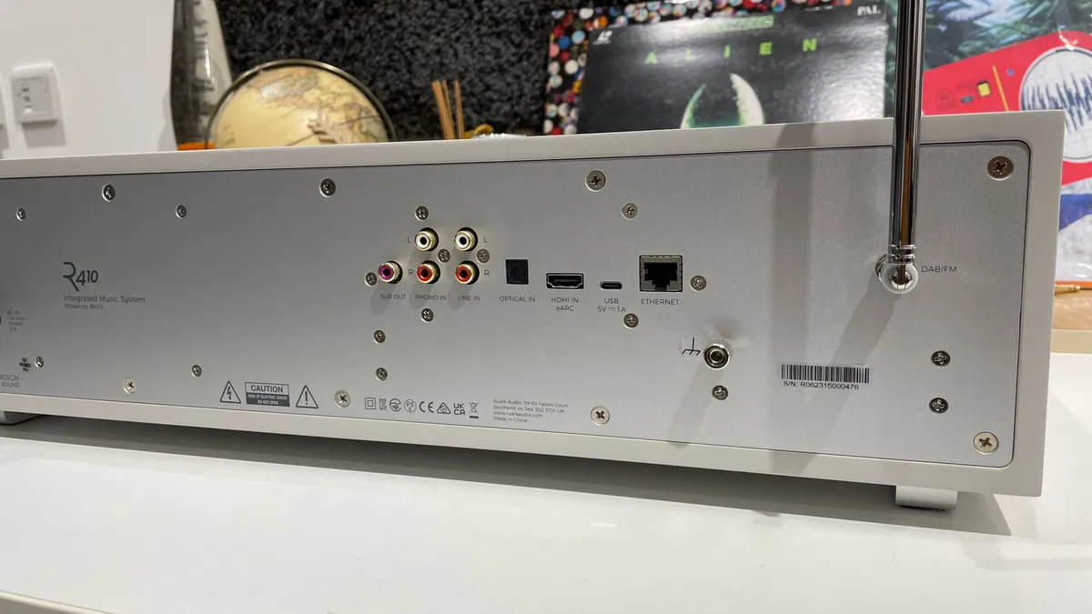 R410の裏面にはラジオ受信のためのアンテナをはじめ、すべての物理的な接続端子があります。もちろん、Ethernet端子とアナログライン入力用のステレオRCA入力端子があります。